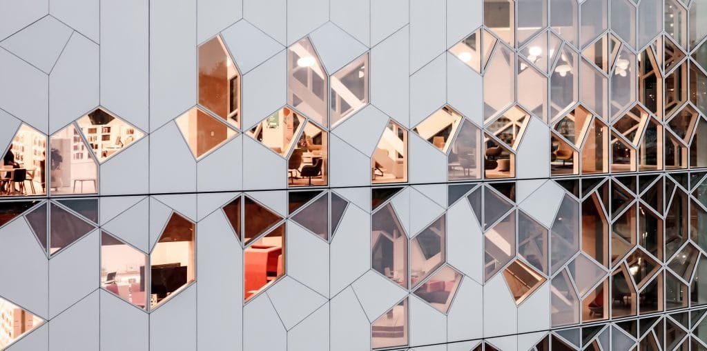 Above that base, the building shifts into a completely different system. The façade becomes a unitized assembly of glass and metal arranged into a repeating hexagonal pattern that wraps continuously around the structure. There is no true front or back elevation. The geometry reads as consistent from every angle, which is part of what gives the building its object-like quality in the city.
