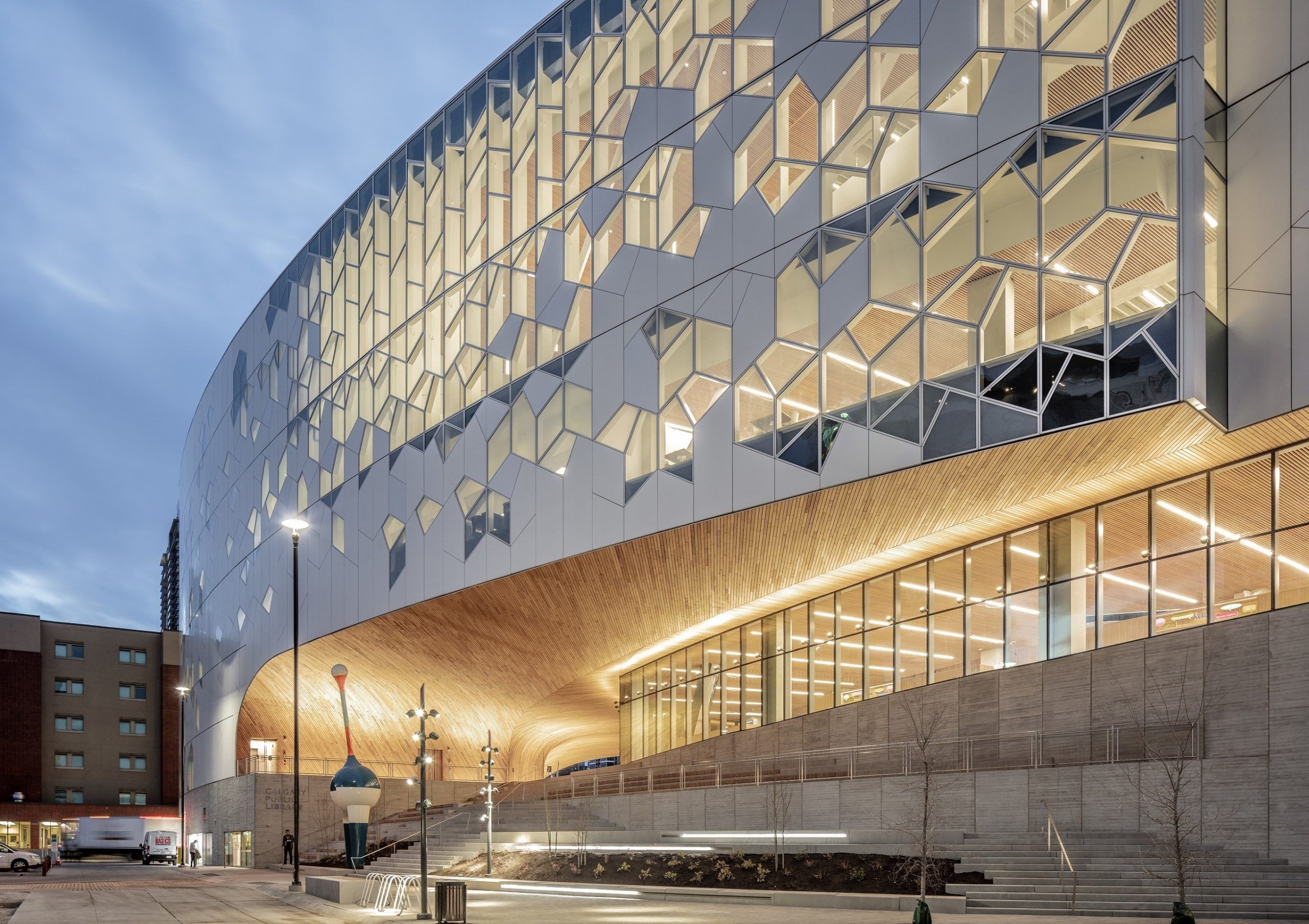 The Calgary Central Library is often recognized for its striking crystalline form, but the real story sits in how a series of very different materials were coordinated into a single, highly controlled system. What looks expressive on the outside is tightly engineered underneath.
